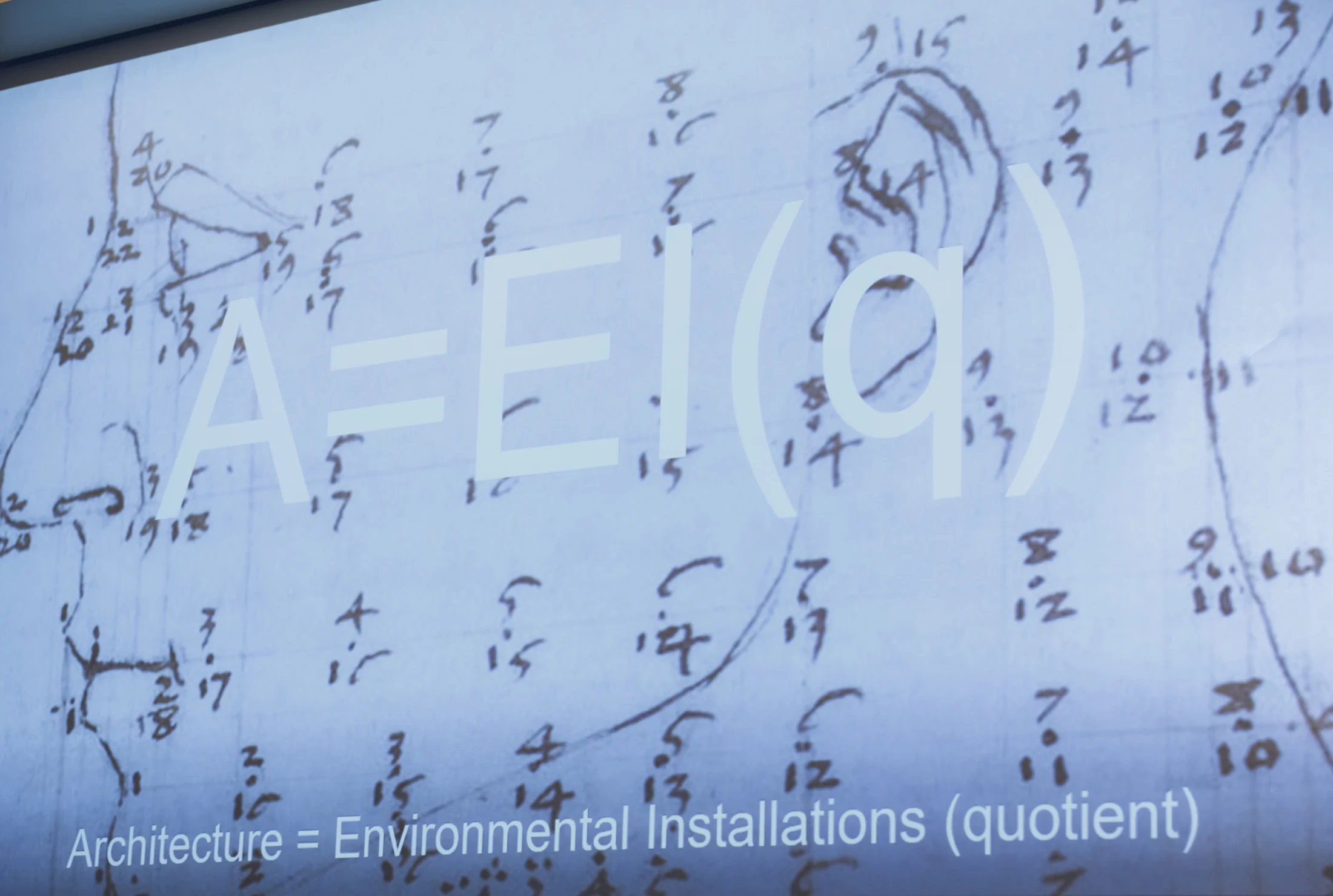 A = E I ( q )というこの⽅程式は、EI(Environmental Installation:環境への働きかけ)、そして q という定義しにくいミステリアスな変数の2つの要素で成り⽴っています。この2つが組み合わさることで“A=建築”が形づくられるという考え⽅です。急激な変化が続く時代において、q はその変化に歩調を合わせようとする私たちの能力、そして未来への希望とも言えます。この方程式は、環境への働きかけ(Environmental Installation)と、人間がもたらす変化との関係性に着目したパラダイムです。人間と自然のバランスを探りながら、その文脈に応じて変数に意味を与えるのはデザイナーの役割であり、そこには建築家としての社会的な責任も含まれています。