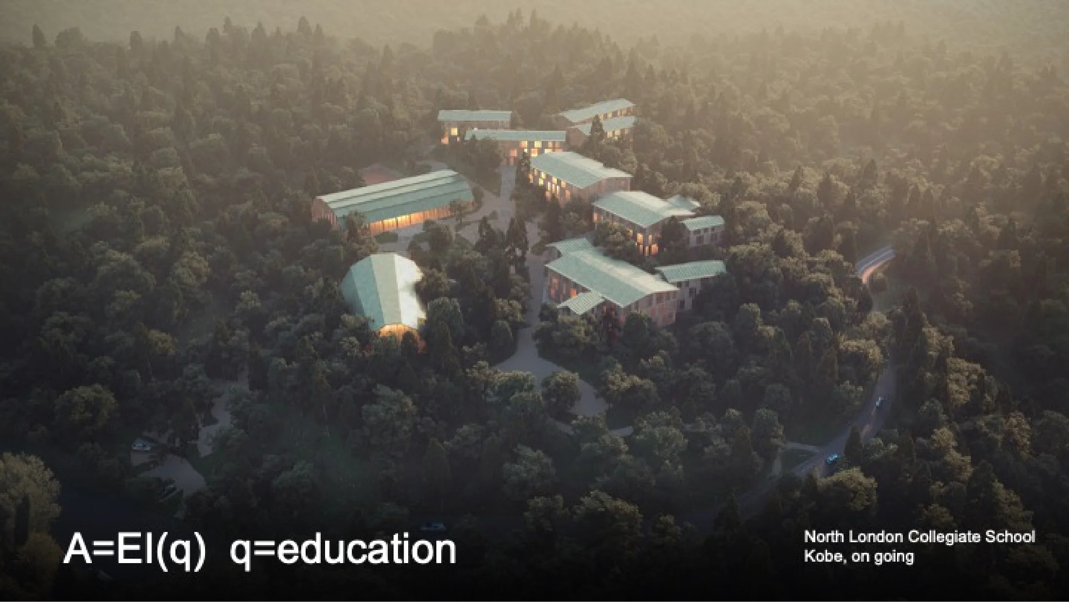 神戸の六甲山に計画中の学校です。これは個人的にも好きなプロジェクトのひとつです。イタリアの小さな村のような構成をしていて、建物内にはジムやシアターや教室、ドミトリーができる予定です。いまの子どもたちは頭は鍛えられていると思いますが、心はどうでしょうか。こういった自然に囲まれた環境で、メンタリティについての大事なことを学べる、そういった場になる予定です。